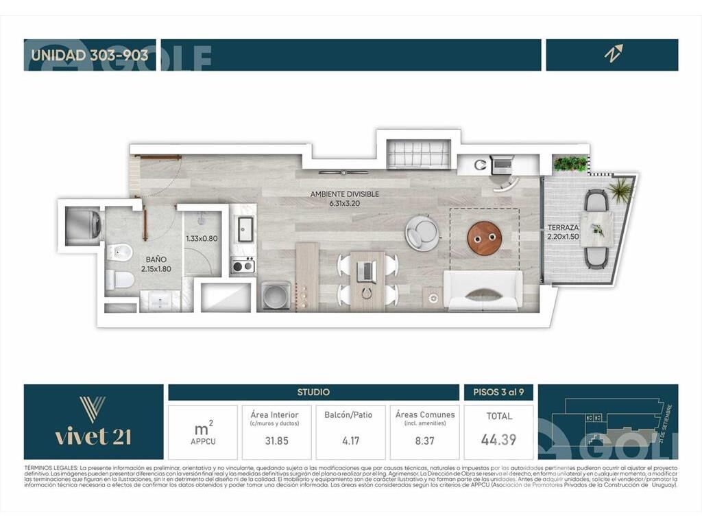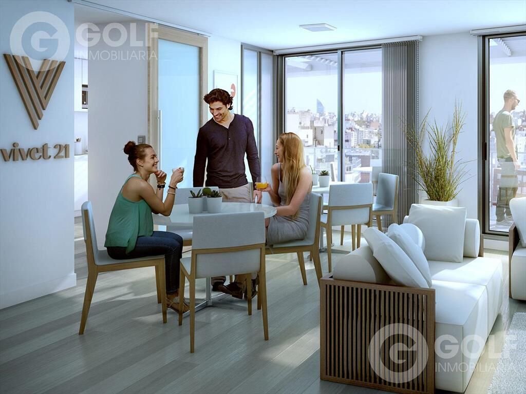 Venta Monoambiente con terraza en Punta Carretas - Living comedor con salida a terraza - Cocina integrada por barra - Baño Completo - 3650 m2 en 13 plantas. - 2 subsuelos. - 45 apartamentos. - Studios, 1, 2 y 3 dormitorios. - 23 garages con previsión para carga eléctrica individual. - Bike parking. - Oficina comercial en Planta Baja. - Laundry con tarjeta o app. - Clasificador de residuos. - Sky lounge con barbacoa cerrada, cocina y parrilla. - Barbacoa con outdoor lounge y vista panorámica. Gastos de ocupación: 4,25% INMOBILIARIA GOLF Afiliados a Cámara Inmobiliaria Uruguaya