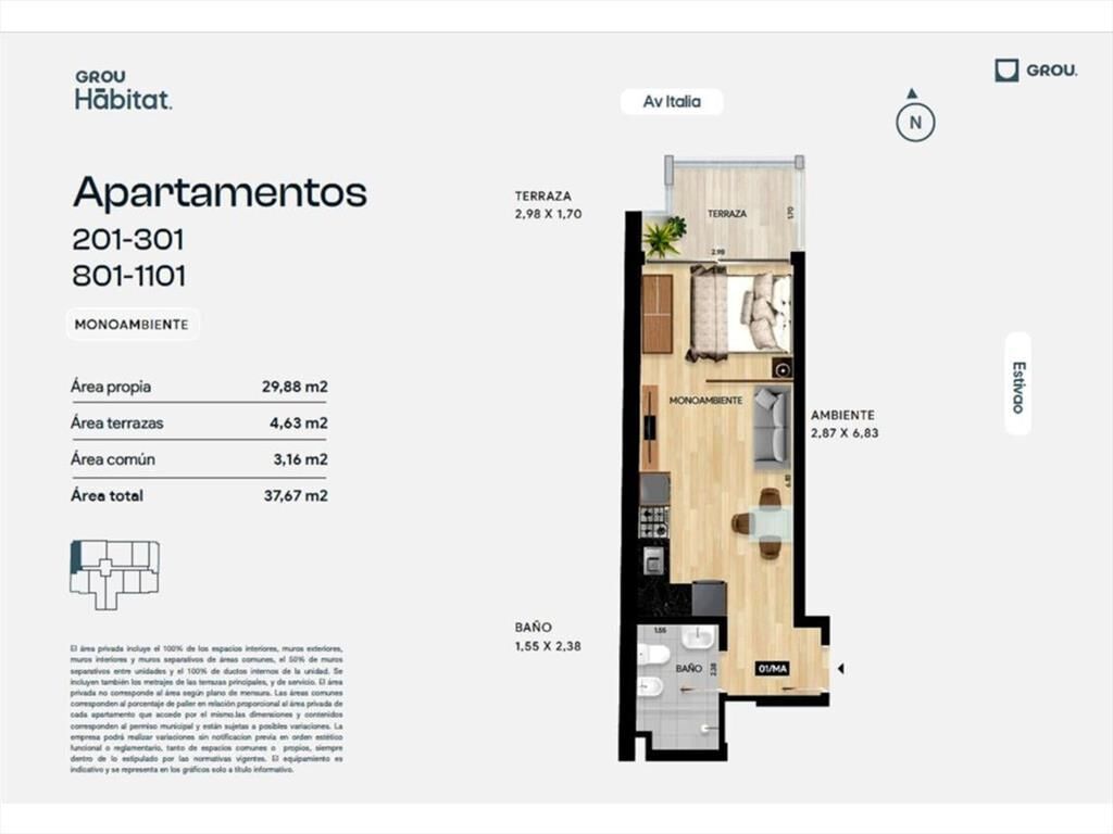 Monoambiente en venta en GROU Habitat, ubicado en Av. Italia y Estivao, excelente punto en Parque Batlle zona de gran accesibilidad, con movilidad a cualquier parte de la ciudad.
