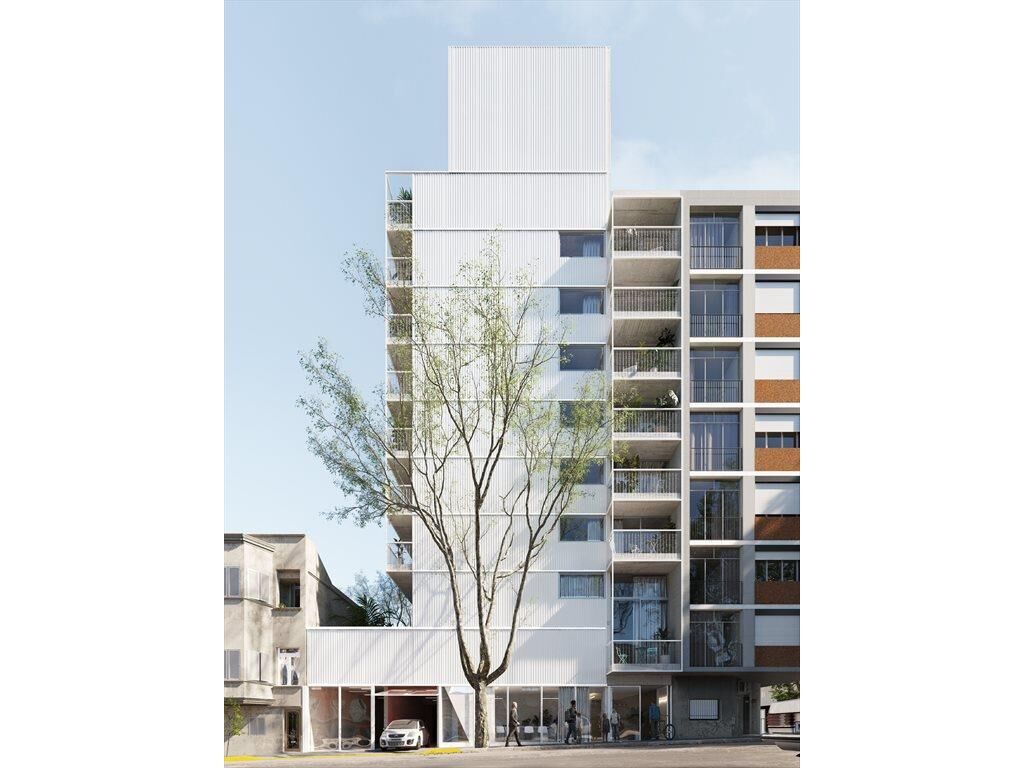 El edificio realiza un giro de 90 grados orientando su fachada principal hacia el Rio de la Plata sin desatender la continuidad con el entorno urbano inmediato. A través de un sistema circulatorio de pasarelas que ventilan a un patio interior se organizan 39 unidades.