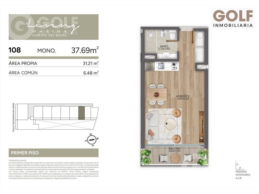 MONOAMBIENTE CON TERRAZA EN BUCEO Ideal para vivir o invertir, este moderno monoambiente se destaca por su diseño funcional y su terraza de uso exclusivo, ubicado en una de las zonas con mayor crecimiento de Montevideo. Características de la unidad: Amplio ambiente principal con living comedor Cocina integrada con mesada de granito, pileta de acero inoxidable y placares bajo y sobre mesada Extractor instalado Baño completo con grifería y accesorios de primera calidad Losa radiante eléctrica individual Previsión para aire acondicionado Instalación prevista para lavarropas Grandes aberturas de aluminio anodizado con doble vidrio (DVH) Pisos vinílicos SPC importados símil madera Pisos de porcelanato importado en baño Cortinas de enrollar Amenities del edificio: Hall de recepción Barbacoa con terraza Espacio de cowork con terraza Gimnasio totalmente equipado Laundry con área de tendido Ascensor de última generación Cerramiento con visor Sistema de cámaras de seguridad Información adicional: Gastos de ocupación: 5.5% Cocheras opcionales desde USD 25.000 Boxes opcionales desde USD 3.000 Confort, diseño y calidad en un entorno estratégico. Consultá por disponibilidad y coordiná tu visita. INMOBILIARIA GOLF Afiliados a Cámara Inmobiliaria Uruguaya