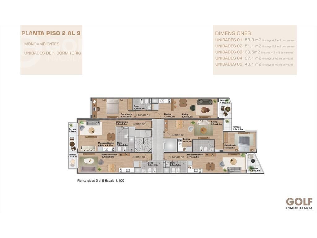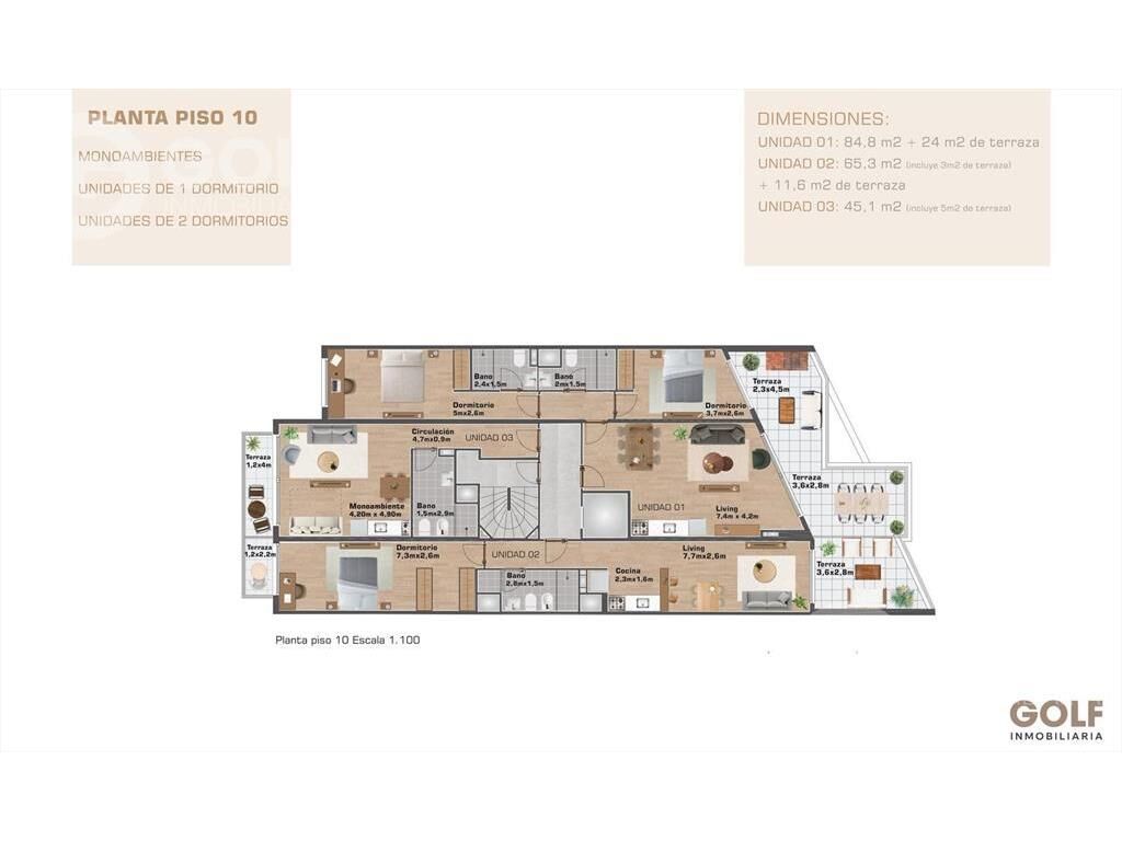 Cuenta con 11 niveles con diferentes tipologías; monoambiente, 1 dormitorio y 2 dormitorios, todas las unidades tienen balcones.
