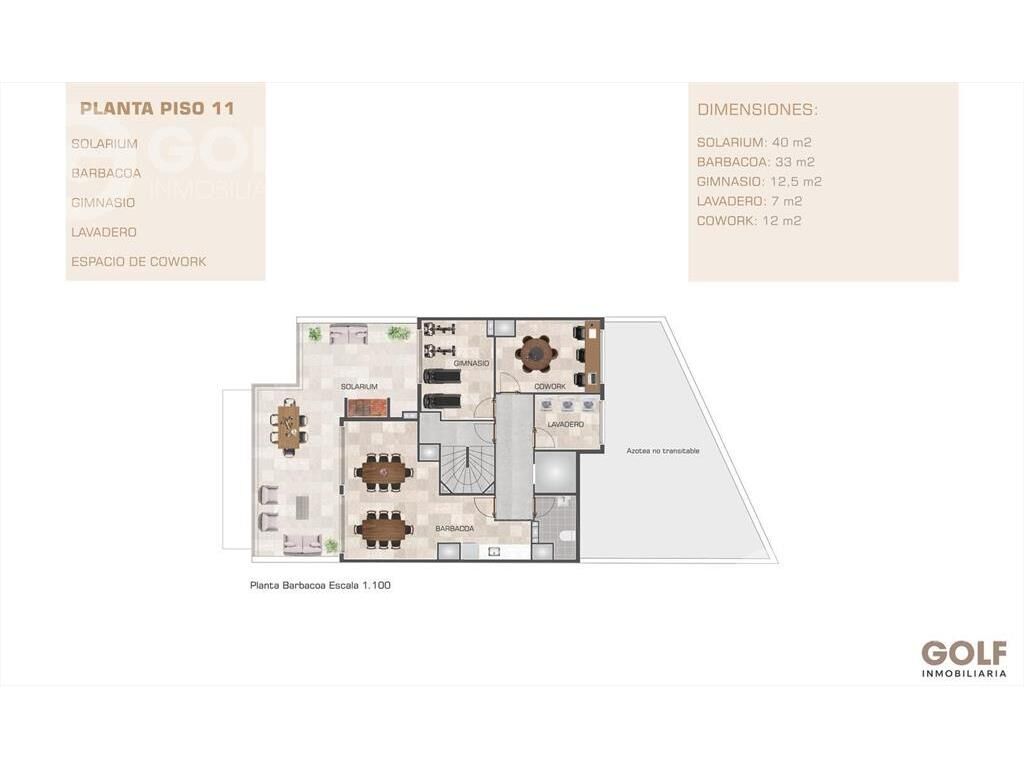 El piso 11 cuenta con solárium, barbacoa, gimnasio, lavadero y espacio de co-work.