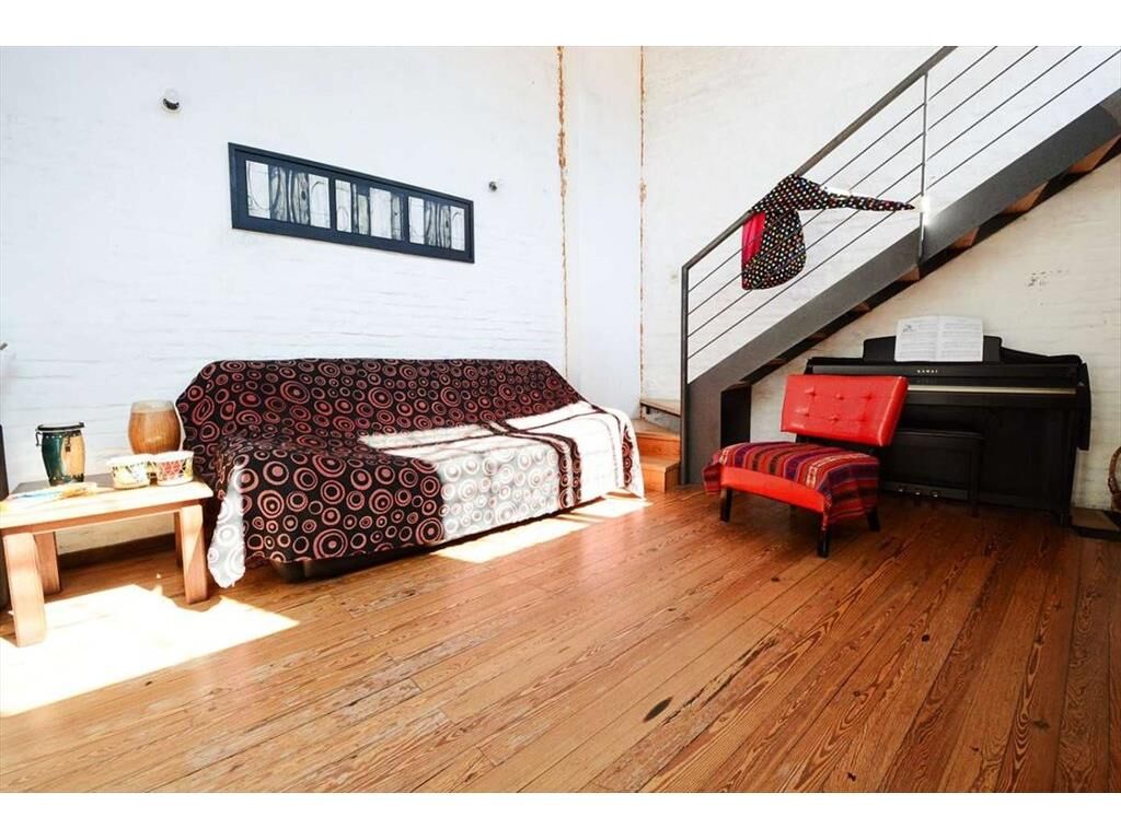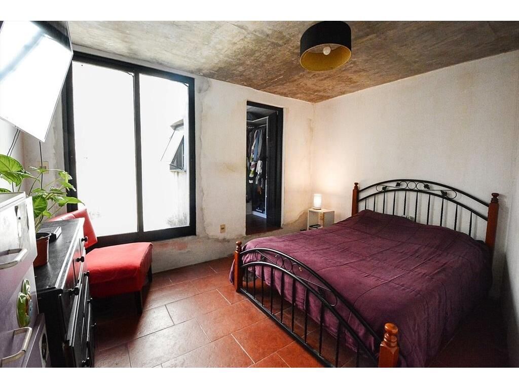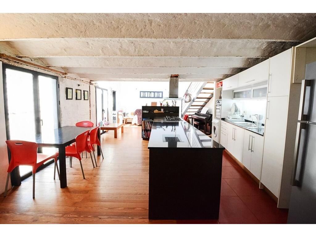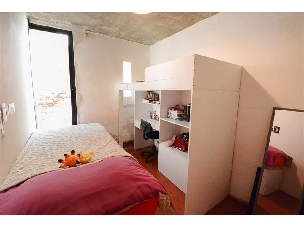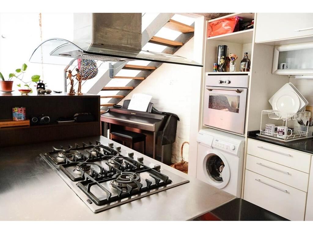 En el piso superior se desarrolla una planta tipo loft, con increíble iluminación natural, donde se destaca una amplia cocina integrada con doble mesada, una isla central con anafe empotrado y campana extractora, y enfrentada a lo largo de la pared medianera, mesada con pileta doble de acero inoxidable y grifería monomando, horno empotrado, conexión para lavarropas y placares sobre y bajo mesada que proporcionan amplio lugar de guardado.