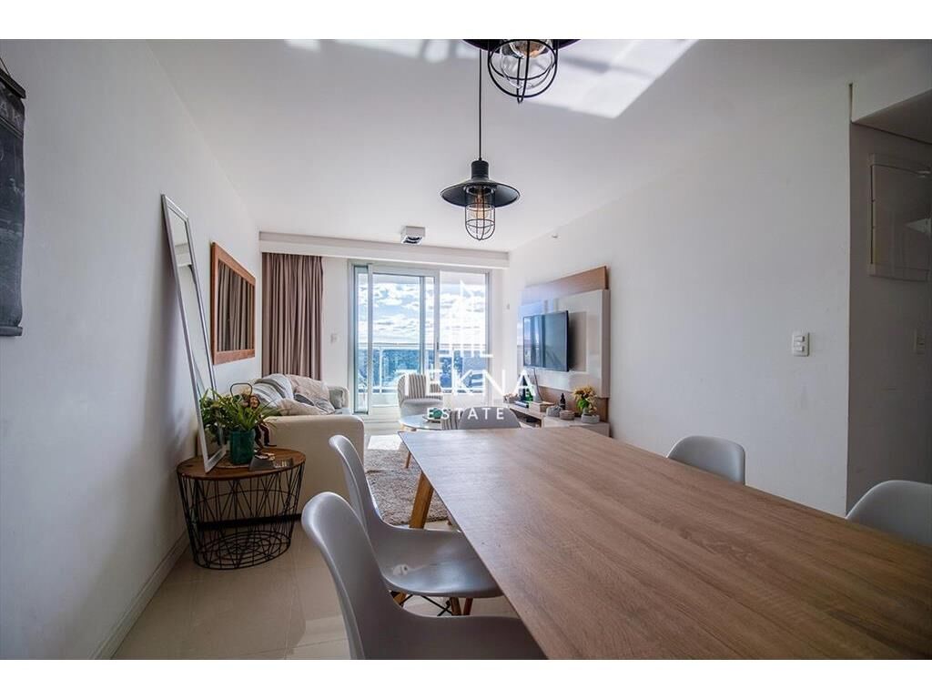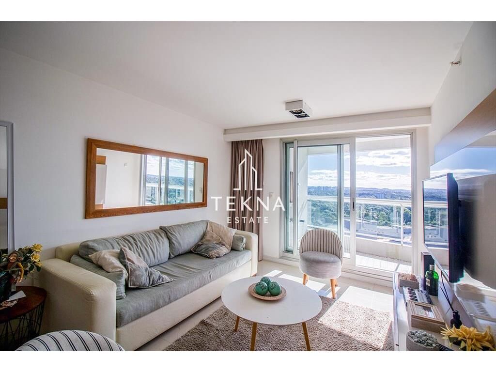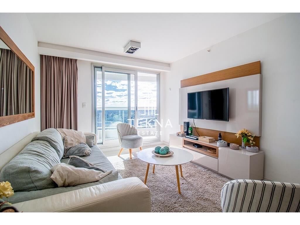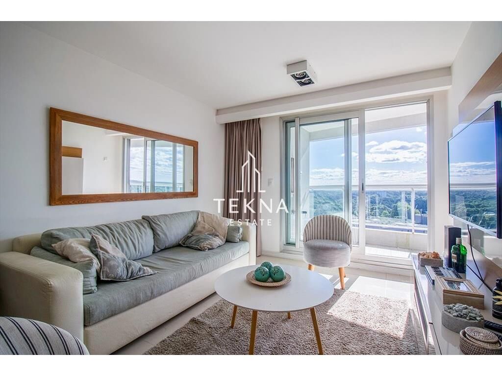 La planta cuenta con un gran metraje para ser de un dormitorio. Tiene dos baños, el principal con bañera y uno social ni bien ingresar. Cuenta con cocina definida, super amplia y también un balcón que conecta todos los ambientes del apartamento, living-comedor, cocina y dormitorio. Además cuenta con parrillero propio, es un espectáculo prender el fuego viendo el atardecer con esta vista.