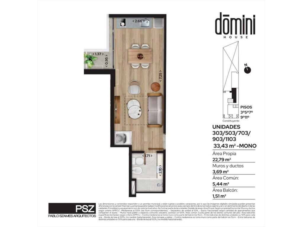 La unidad cuenta con 22,79m2 edificados y 1,51m2 de terraza. Al entrar al apartamento con encontramos con el baño a la izquierda, al frente se encuentra el área del living y el dormitorio. Hacia la derecha nos encontramos con la cocina que cuenta con salida a la terraza.