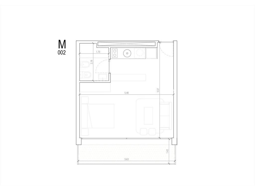 Unidad Monoambiente con salida a terraza. Cocina integrada con bajo mesadas incluidas.