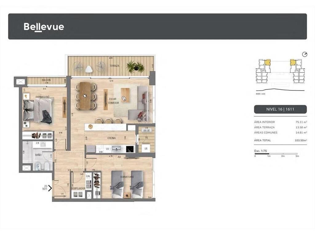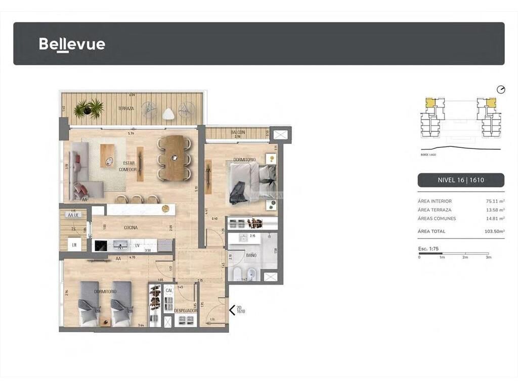 METRAJE: 75,11m área propia + 14,81m área común + 13,58m terrazas = 103,50m totales