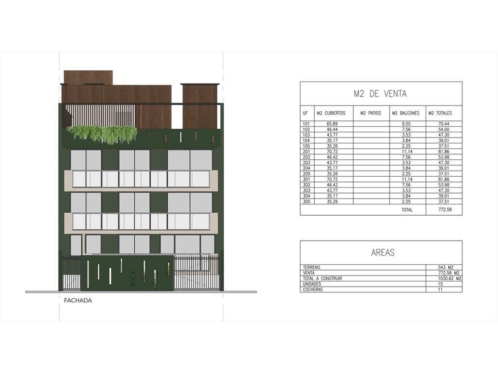 Este proyecto permite la construcción de 15 viviendas, 12 de 1 dormitorio y 3 de 2 dormitorios y 11 lugares de cochera, ideal para inversores interesados en el sector residencial.